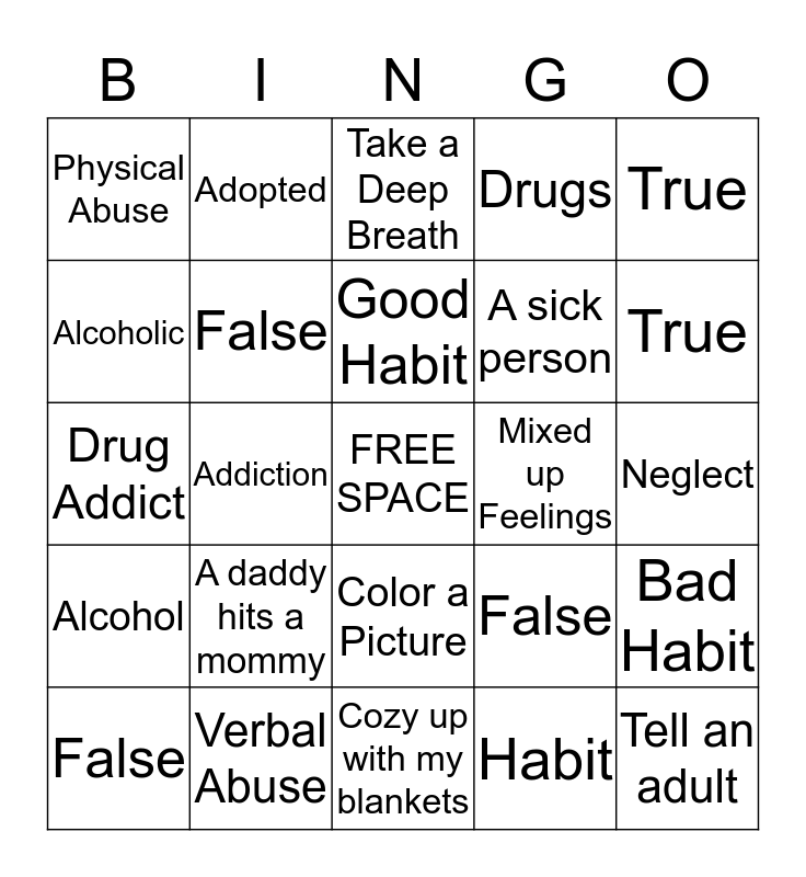 This bingo card has a free space and 24 words: A daddy hits a mommy, Verbal Abuse, Good Habit, False, True, Physical Abuse, Alcoholic, Adopted, Mixed up Feelings, Color a Picture, A sick person, Drug Addict, False, Bad Habit, False, Habit, Neglect, Take a Deep Breath, True, Addiction, Tell an adult, Alcohol, Drugs and Cozy up with my blankets.