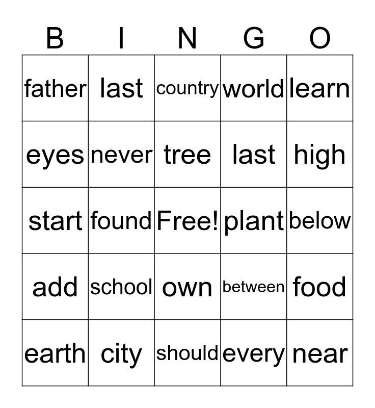This bingo card has a free space and 24 words: school, city, tree, earth, learn, father, eyes, last, plant, own, last, start, between, food, never, every, below, country, high, found, near, add, world and should.