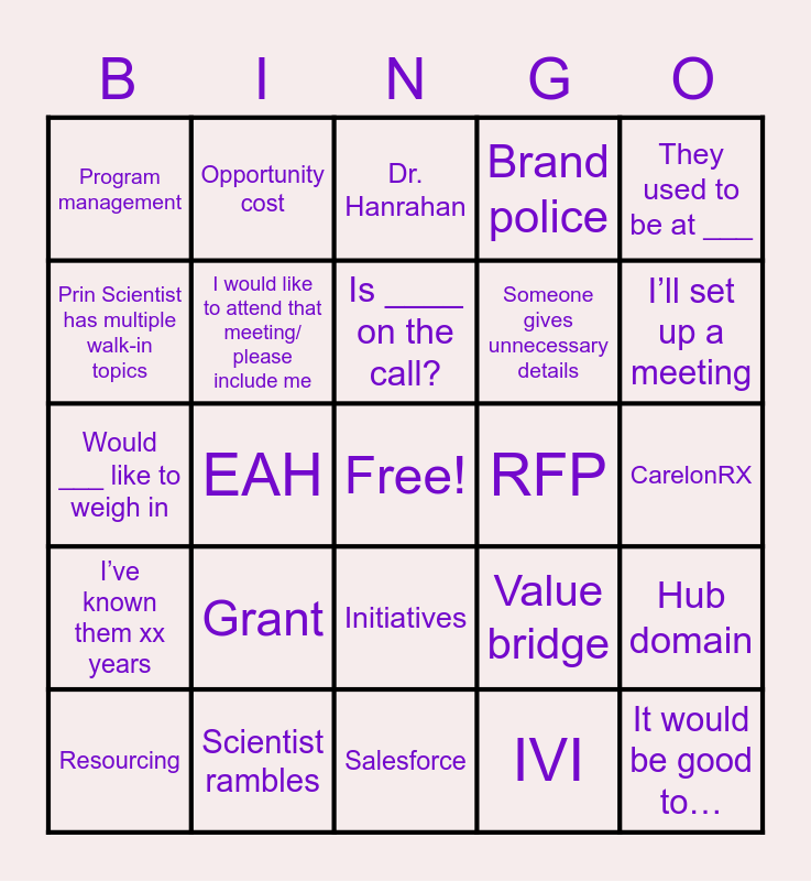 This bingo card has a free space and 34 words: Let’s talk offline, IVI, Unfunded work, PCR, I’ve known them xx years, I would like to attend that meeting/ please include me, They used to be at ___, Resourcing, Opportunity cost, Parent organization/ big business daddy, Is ____ on the call?, Dr. Hanrahan, Revenue, Substantiate, RFP, I’ll set up a meeting, Scientist rambles, Would ___ like to weigh in, Grant, Value bridge, Initiatives, HealthCore, Program management, CarelonRX, Salesforce, It would be good to…, Brand police, Philadelphia sports, Someone gives unnecessary details, Prin Scientist has multiple walk-in topics, UMB, EAH, Hub domain and We had a good meeting.