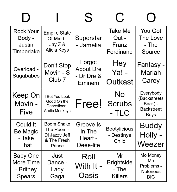 This bingo card has a free space and 31 words: Roll With It - Oasis, 1 Thing - Amerie, I Bet You Look Good On the Dancefloor - Arctic Monkeys, Love Machine - Girls Aloud, Rock Your Body - Justin Timberlake, Superstar - Jamelia, Don't Stop Movin - S Club 7, Bootylicious - Destinys Child, No Scrubs - TLC, Mr Brightside - The Killers, Everybody (Backstreets Back) - Backstreet Boys, Mo Money Mo Problems - Notorious BIG, Semi Charmed Life - Third Eye Blind, Gangstas Paradise - Coolio, Fantasy - Mariah Carey, Girls & Boys - Blur, Buddy Holly - Weezer, Boom Shake The Room - Dj Jazzy Jeff & The Fresh Prince, Could It Be Magic - Take That, Groove Is In The Heart - Deee-lite, You Got The Love - The Source, Wannabe - Spice Girls, Baby One More Time - Britney Spears, Empire State Of Mind - Jay Z & Alicia Keys, Hey Ya! - Outkast, Overload - Sugababes, Take Me Out - Franz Ferdinand, Keep On Movin - Five, Just Dance - Lady Gaga, Forgot About Dre - Dr Dre & Eminem and Crazy In Love - Beyonce & Jay Z.