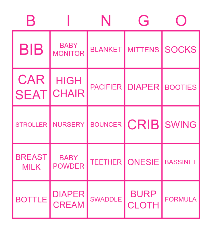 This bingo card has a free space and 24 words: BABY POWDER, DIAPER CREAM, PACIFIER, BOTTLE, SOCKS, BIB, CAR SEAT, BABY MONITOR, CRIB, TEETHER, DIAPER, STROLLER, ONESIE, BASSINET, HIGH CHAIR, BURP CLOTH, SWING, BLANKET, BOOTIES, NURSERY, FORMULA, BREAST MILK, MITTENS and SWADDLE.