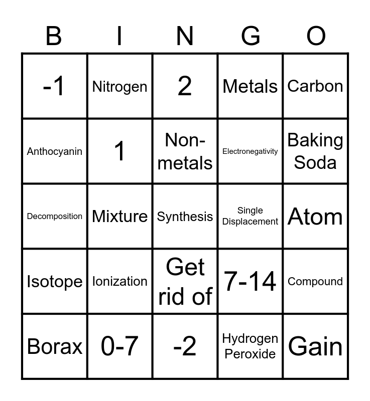 This bingo card has 25 words: Ionization, -2, Non-metals, Borax, Carbon, -1, Anthocyanin, Nitrogen, Single Displacement, Get rid of, Electronegativity, Decomposition, 7-14, Compound, 1, Gain, Atom, 2, Baking Soda, Mixture, Synthesis, 0-7, Isotope, Metals and Hydrogen Peroxide.