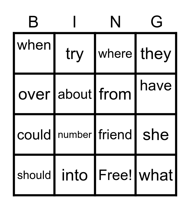 This bingo card has 17 words: Free!, should, where, when, number, they, she, from, have, about, into, friend, over, try, could, his and what.