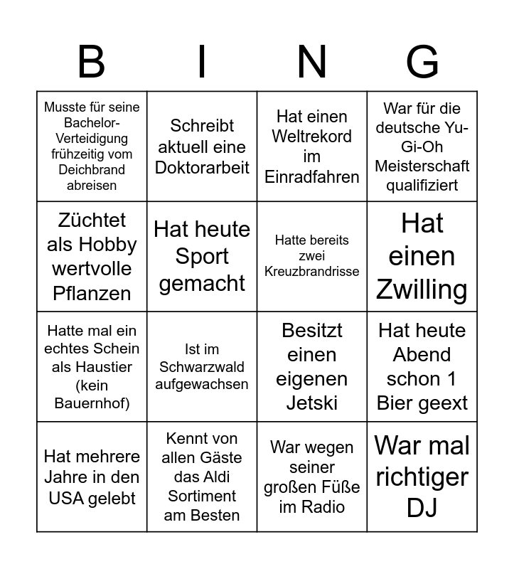 This bingo card has 34 words: Free!, Ist mit ihrem/seinem Bruder hier, Ist den Jacobsweg gelaufen, War in Norwegen im Auslandssemester, War mal richtiger DJ, Hatte bereits zwei Kreuzbrandrisse, Züchtet als Hobby wertvolle Pflanzen, Ist nebenberuflich selbstständig, Schreibt aktuell eine Doktorarbeit, Spielt Schach im Verein, Hat einen Zwilling, Hat einen Weltrekord im Einradfahren, War drei Mal an einem Tag im Krankenhaus, Baut eine Schule für Flüchtlinge auf, Kennt von allen Gäste das Aldi Sortiment am Besten, Ist im Schwarzwald aufgewachsen, Arbeitete in einer Patisserie in Frankreich, Besitzt einen eigenen Jetski, Ist an einem Tag von Flensburg nach Kiel gelaufen, Ist mit dem Fahrrad von Wien nach Istanbul gefahren, Ist im Freizeitpark ausgerufen worden, Hat über 6.000 Follower auf Instagram, Musste für seine Bachelor-Verteidigung frühzeitig vom Deichbrand abreisen, War wegen seiner großen Füße im Radio, Hat als Fahrrad-Tourguide in Indien gearbeitet, Hat mehrere Jahre in den USA gelebt, War für die deutsche Yu-Gi-Oh Meisterschaft qualifiziert, Ist auf einem McDonalds Parkplatz gegen eine Laterne gefahren, Hatte mal ein echtes Schein als Haustier (kein Bauernhof), Hat heute Sport gemacht, Hat heute Abend schon 3 Tequila getrunken, Hat heute Abend schon 1 Bier geext, Besitzt ein eigenes Motorrad and Lebt seit über 10 Jahren in Hamburg.
