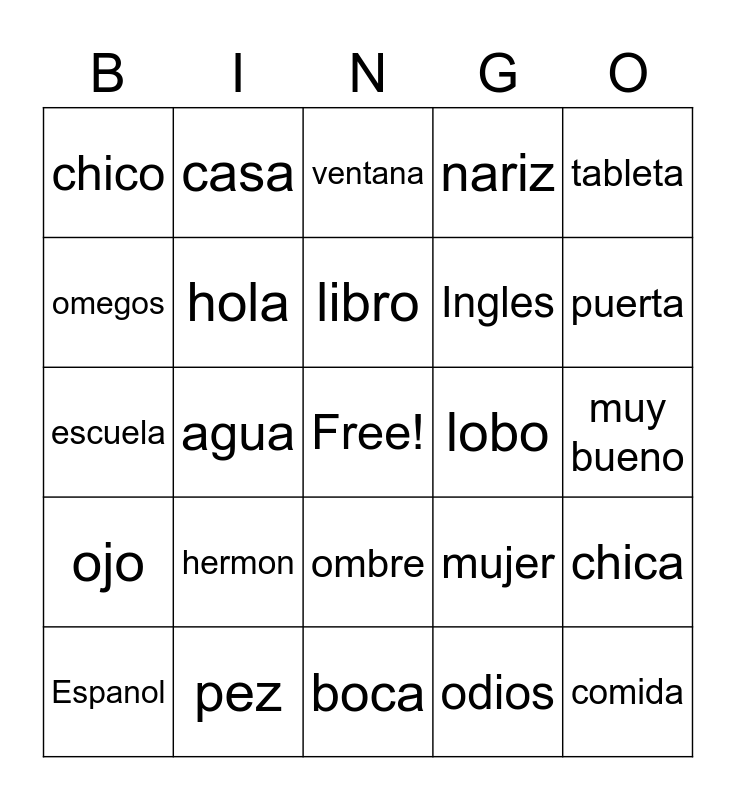 This bingo card has a free space and 24 words: hermon, pez, libro, Espanol, tableta, chico, omegos, casa, lobo, ombre, Ingles, escuela, mujer, chica, hola, odios, muy bueno, ventana, puerta, agua, comida, ojo, nariz and boca.