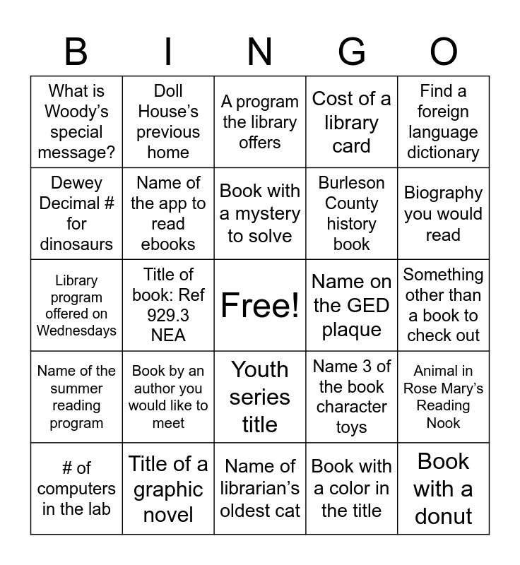 This bingo card has a free space and 24 words: # of computers in the lab, Book by an author you would like to meet, Book with a mystery to solve, Book with a color in the title, Find a foreign language dictionary, What is Woody’s special message?, Doll House’s previous home, A program the library offers, Name on the GED plaque, Something other than a book to check out, Library program offered on Wednesdays, Name of the app to read ebooks, Name 3 of the book character toys, Animal in Rose Mary’s Reading Nook, Dewey Decimal # for dinosaurs, Title of a graphic novel, Name of librarian’s oldest cat, Cost of a library card, Biography you would read, Name of the summer reading program, Title of book: Ref 929.3 NEA, Youth series title, Burleson County history book and Book with a donut.