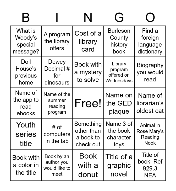 This bingo card has a free space and 24 words: # of computers in the lab, Book by an author you would like to meet, Book with a mystery to solve, Book with a color in the title, Find a foreign language dictionary, What is Woody’s special message?, Doll House’s previous home, A program the library offers, Name on the GED plaque, Something other than a book to check out, Library program offered on Wednesdays, Name of the app to read ebooks, Name 3 of the book character toys, Animal in Rose Mary’s Reading Nook, Dewey Decimal # for dinosaurs, Title of a graphic novel, Name of librarian’s oldest cat, Cost of a library card, Biography you would read, Name of the summer reading program, Title of book: Ref 929.3 NEA, Youth series title, Burleson County history book and Book with a donut.