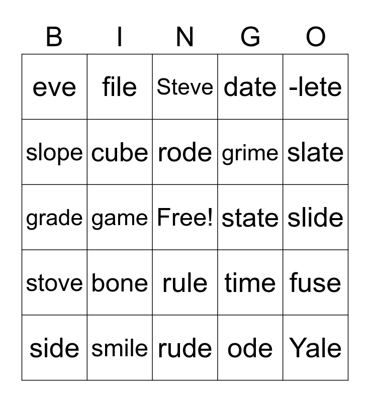 This bingo card has a free space and 29 words: side, Rome, game, flute, eve, Steve, cube, bone, state, smile, slide, Yale, rude, ode, slate, slime, rule, stove, -lete, grade, time, use, grime, slope, date, file, fuse, rode and mope.