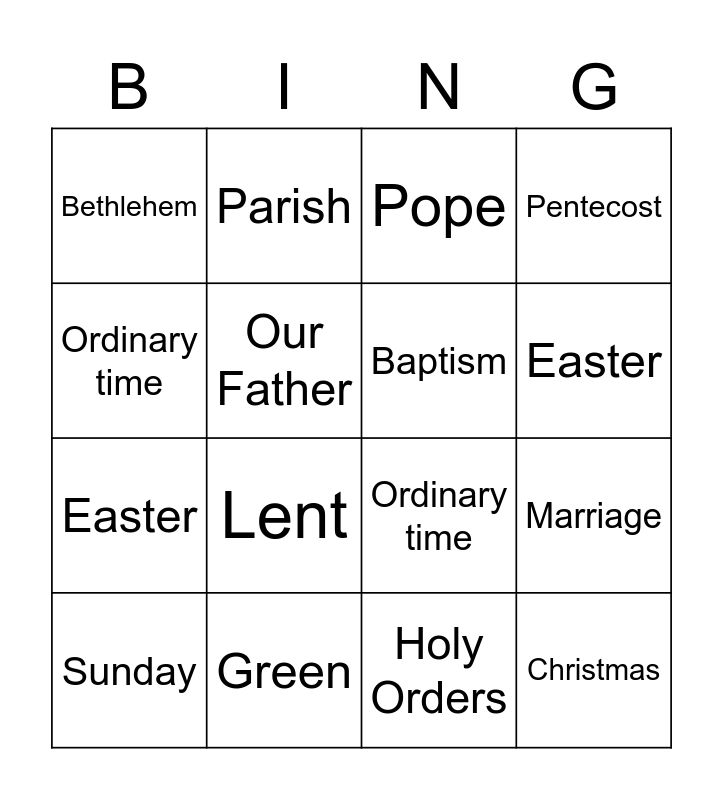 This bingo card has 22 words: Green, Priest, Parish, Bible, Our Father, Baptism, Bethlehem, Pope, Ordinary time, Christmas, Easter, Pentecost, Triduum, The Blessed Trinity, Holy Orders, Prayer, Marriage, Sunday, Lent, Ordinary time, Easter and Act of Contrition.