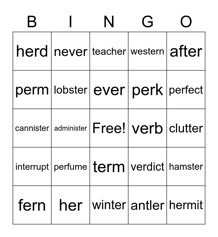 This bingo card has a free space and 24 words: perfume, her, ever, fern, after, herd, perm, never, verb, term, perk, cannister, verdict, hamster, lobster, antler, clutter, teacher, perfect, administer, hermit, interrupt, western and winter.