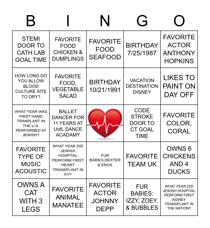 This bingo card has a free space and 24 words: WHAT YEAR DID JEWISH HOSPITAL PERFORM FIRST HEART TRANSPLANT IN KY?, FAVORITE ANIMAL MANATEE, BIRTHDAY 10/21/1991, OWNS A CAT WITH 3 LEGS, FAVORITE ACTOR ANTHONY HOPKINS, STEMI DOOR TO CATH LAB GOAL TIME, HOW LONG DO YOU ALLOW BLOOD CULTURE SITE TO DRY?, FAVORITE FOOD CHICKEN & DUMPLINGS, CODE STROKE DOOR TO CT GOAL TIME, FUR BABIES,DEXTER & ENOS, VACATION DESTINATION DISNEY, WHAT YEAR WAS FIRST HAND TRANPLANT IN THE U.S. PERFORMED AT JEWISH?, FAVORITE TEAM UK, OWNS 6 CHICKENS AND 4 DUCKS, FAVORITE FOOD, VEGETABLE SALAD, FUR BABIES: IZZY, ZOEY, & BUBBLES, FAVORITE COLOR, CORAL, FAVORITE FOOD SEAFOOD, LIKES TO PAINT ON DAY OFF, BALLET DANCER FOR 11 YEARS AT UofL DANCE ACADAMY, WHAT YEAR DID JEWISH HOSPITAL PERFORM FIRST KIDNEY TRANSPLANT IN THE NATION?, FAVORITE TYPE OF MUSIC ACOUSTIC, BIRTHDAY 7/25/1987 and FAVORITE ACTOR JOHNNY DEPP.