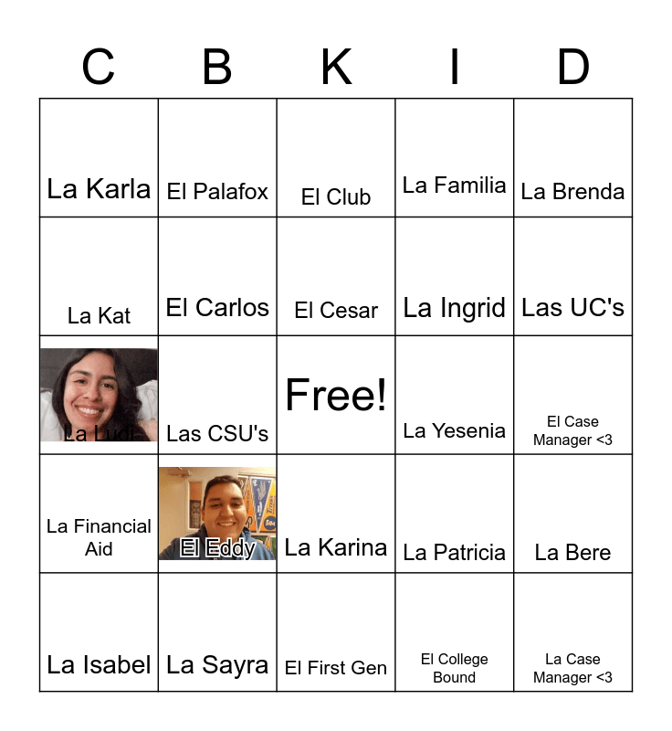 This bingo card has 2 images, a free space and 24 words: El Eddy, La Sayra, El Cesar, La Isabel, La Brenda, La Karla, La Kat, El Palafox, La Yesenia, La Karina, La Ingrid, La Ludi, La Patricia, La Bere, El Carlos, El College Bound, El Case Manager <3, El Club, Las UC's, Las CSU's, La Case Manager <3, La Financial Aid, La Familia and El First Gen.