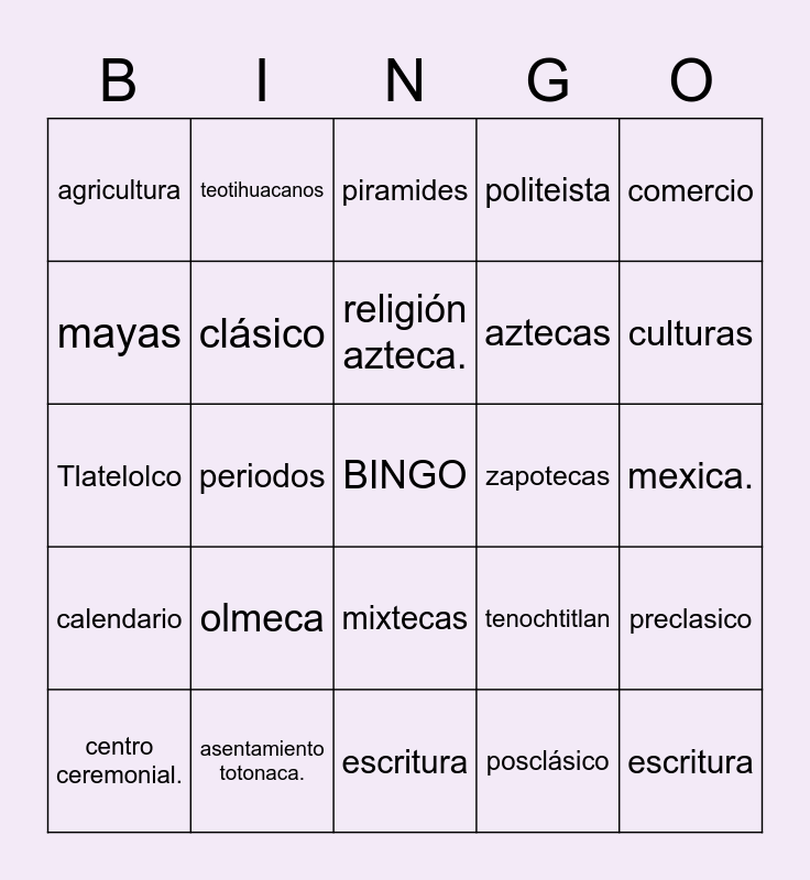 This bingo card has a free space and 24 words: olmeca, asentamiento totonaca., religión azteca., centro ceremonial., comercio, agricultura, mayas, teotihuacanos, zapotecas, mixtecas, aztecas, Tlatelolco, tenochtitlan, preclasico, clásico, posclásico, mexica., piramides, culturas, periodos, escritura, calendario, politeista and escritura.