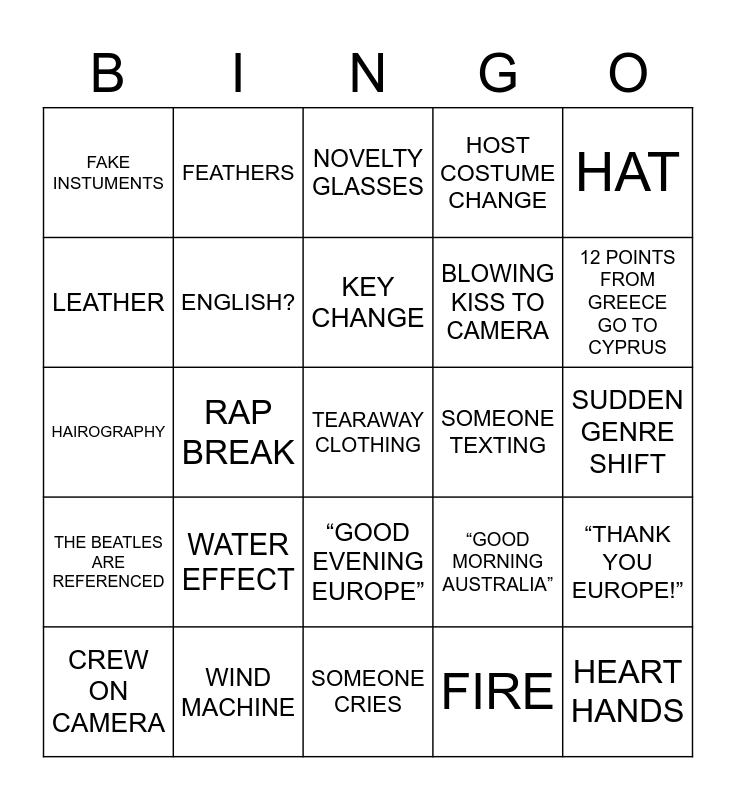 This bingo card has 53 words: Free!, TEARAWAY CLOTHING, OFF-KEY NOTE, FIRE, WATER EFFECT, SPARKS, FEATHERS, NUDE ILLUSION, LEATHER, BARE FEET, ENGLISH?, SONG NOT IN ENGLISH, “THANK YOU EUROPE!”, “GOOD MORNING AUSTRALIA”, TECH ISSUES, CREW ON CAMERA, KEY CHANGE, SOMEONE TEXTING, SELFIE, HAT, RAP BREAK, HEART HANDS, BLOWING KISS TO CAMERA, FAKE INSTUMENTS, FLAG FACEPAINT, WIND MACHINE, FOG, SEQUINS, SOMEONE GET ZERO POINTS, 12 POINTS FROM GREECE GO TO CYPRUS, PERFORMER WINKS AT THE CAMERA, BARE MIDRIFF, JUMPSUIT, UNCOMFORTABLE DELAY IN VOTING CROSS, GUYLINER, STAGE INVADER, HOST COSTUME CHANGE, SOMEONE CRIES, NOVELTY GLASSES, CLAPPING BIT, ACHIEVABLE CHOREOGRAPHY, ALL WHITE OUTFIT, SUDDEN GENRE SHIFT, WARDROBE MALFUNCTION, “LET’S GO!”, “GOOD EVENING EUROPE”, “THANKS FOR A WONDERFUL SHOW”, BODY GLITTER, HAIROGRAPHY, THE BEATLES ARE REFERENCED, UNICORN HORN HEADBAND, HOST DOES A DANCE and PHOTOBOMBING IN A GREENROOM CROSS.