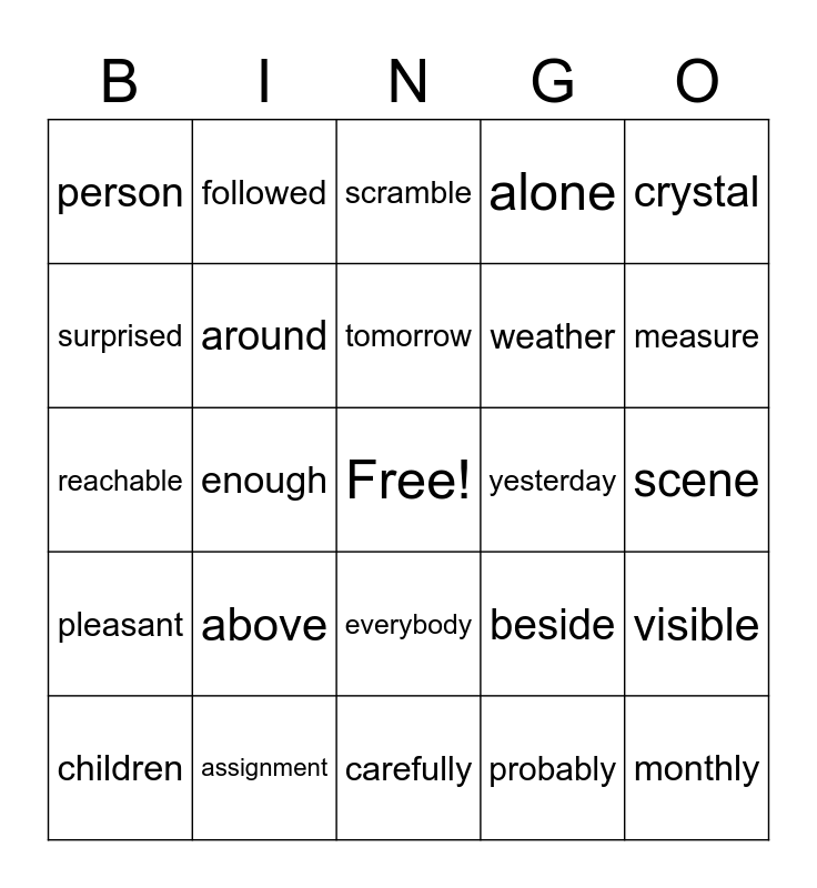 This bingo card has a free space and 49 words: listening, monthly, softly, carefully, above, something, followed, suppose, surprised, notice, around, alone, visible, beside, remember, someone, tomorrow, yesterday, jealous, crystal, enough, probably, person, weather, treasure, measure, children, certainly, everybody, pleasant, meadow, mystery, syrup, against, assignment, crumbs, wrinkle, know, scene, laughed, heard, sleigh, thief, eyeglasses, reachable, scramble, central, knuckle and vowels.