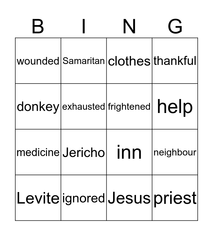 This bingo card has a free space and 18 words: Jericho, thieves, clothes, wounded, priest, thankful, Levite, Samaritan, help, medicine, Jesus, donkey, neighbour, exhausted, frightened, road, ignored and relieved.