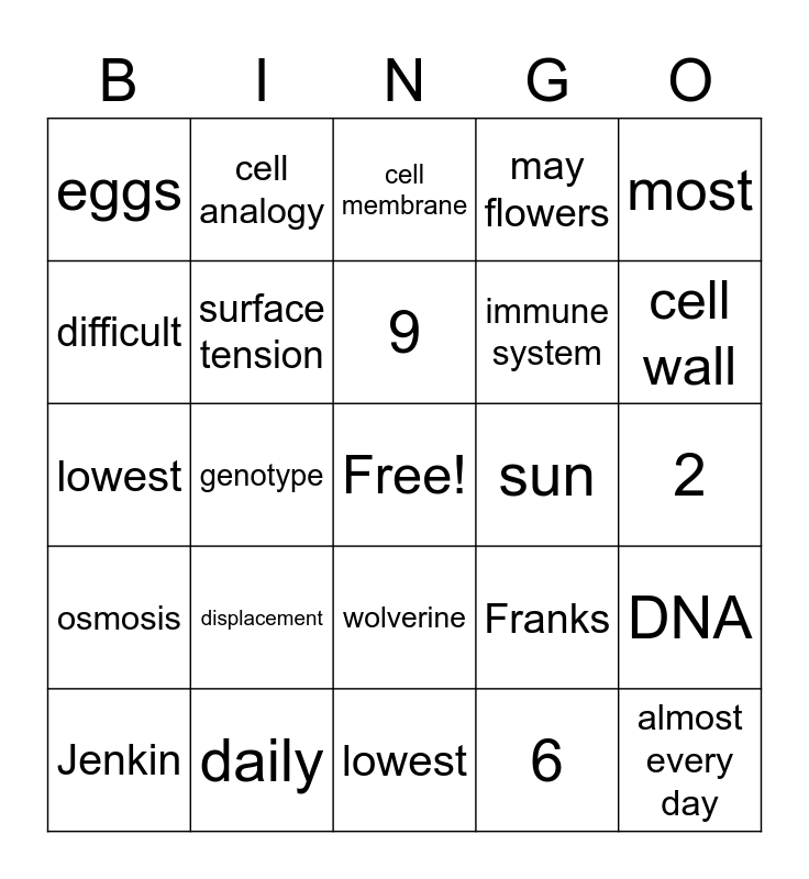 This bingo card has a free space and 29 words: Jenkin, 208, genotype, amigo, eggs, cell membrane, surface tension, displacement, sun, daily, 2, almost every day, lowest, 6, cell wall, neutral pH level, wolverine, osmosis, most, lowest, Franks, with 2 hands, immune system, difficult, may flowers, cell analogy, DNA, 9 and lowest.