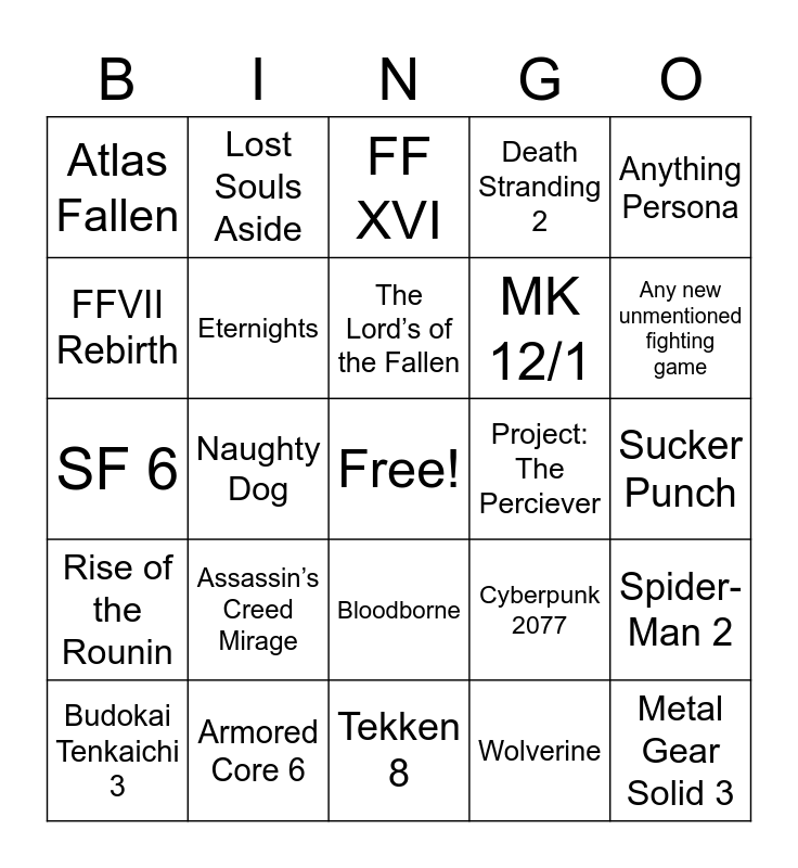 This bingo card has a free space and 28 words: Spider-Man 2, Stellar Blade, MK 12/1, Wolverine, FFVII Rebirth, FF XVI, Lost Souls Aside, Rise of the Rounin, Project: The Perciever, Budokai Tenkaichi 3, SF 6, Death Stranding 2, Armored Core 6, Tekken 8, Any new unmentioned fighting game, PS5 Pro, Assassin’s Creed Mirage, Eternights, The Lord’s of the Fallen, Bloodborne, Atlas Fallen, Persona 6/ Black Myth Wukong/ Where Winds Meet/ Elden Ring DLC/ Hollow Knight Silk Song, Metal Gear Solid 3, Naughty Dog, Sucker Punch, Cyberpunk 2077, Anything Persona and Allan Wake 2.