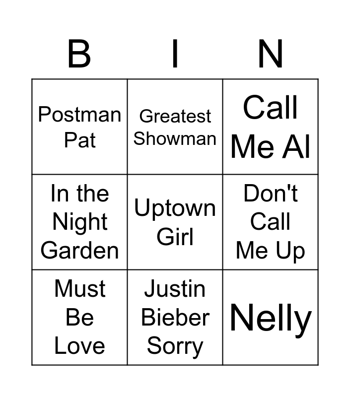 This bingo card has a free space and 11 words: The Beatles, Justin Bieber Sorry, Nelly, Must Be Love, Greatest Showman, Call Me Al, Don't Call Me Up, Soldier Poet King, In the Night Garden, Postman Pat and Peppa Pig.