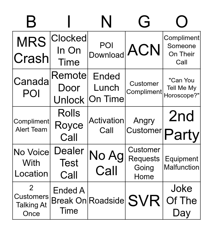 This bingo card has a free space and 24 words: Dealer Test Call, Ended A Break On Time, Ended Lunch On Time, 2 Customers Talking At Once, Compliment Someone On Their Call, MRS Crash, Canada POI, Clocked In On Time, Angry Customer, No Ag Call, Customer Compliment, Compliment Alert Team, Customer Requests Going Home, Equipment Malfunction, Remote Door Unlock, SVR, 2nd Party, POI Download, "Can You Tell Me My Horoscope?", Rolls Royce Call, Joke Of The Day, No Voice With Location, ACN and Roadside.