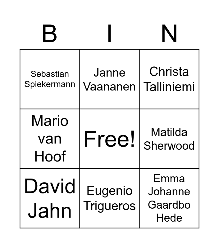 This bingo card has a free space and 9 words: David Jahn, Christa Talliniemi, Janne Vaananen, Mario van Hoof, Sebastian Spiekermann, Matilda Sherwood, Emma Johanne Gaardbo Hede, Maartje Hofs and Eugenio Trigueros.