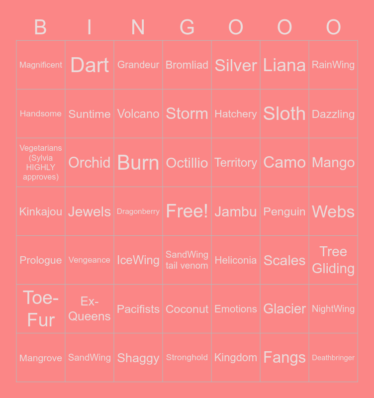 This bingo card has a free space and 62 words: Glory, Kinkajou, Tamarin, Orchid, Deathbringer, NightWing, RainWing, Assassin, Suntime, Mangrove, Bromliad, Coconut, Liana, Jambu, Contest, Magnificent, Sloth, Silver, Exquisite, Handsome, Dazzling, Grandeur, Mango, Dragonberry, Banana, Heliconia, Vengeance, Venom, Camo, Tree Gliding, Rainforest, Pacifists, Fangs, Flowers, Vegetarians (Sylvia HIGHLY approves), Dart, Emotions, Scales, Hatchery, Penguin, Storm, Glacier, Burn, Blaze, Volcano, Territory, IceWing, SandWing, Stronghold, Kingdom, Octillio, Jewels, Queen, Ex-Queens, Cactus, Webs, SandWing tail venom, Toe-Fur, Shaggy, Mind reading, Prologue and Epilogue.
