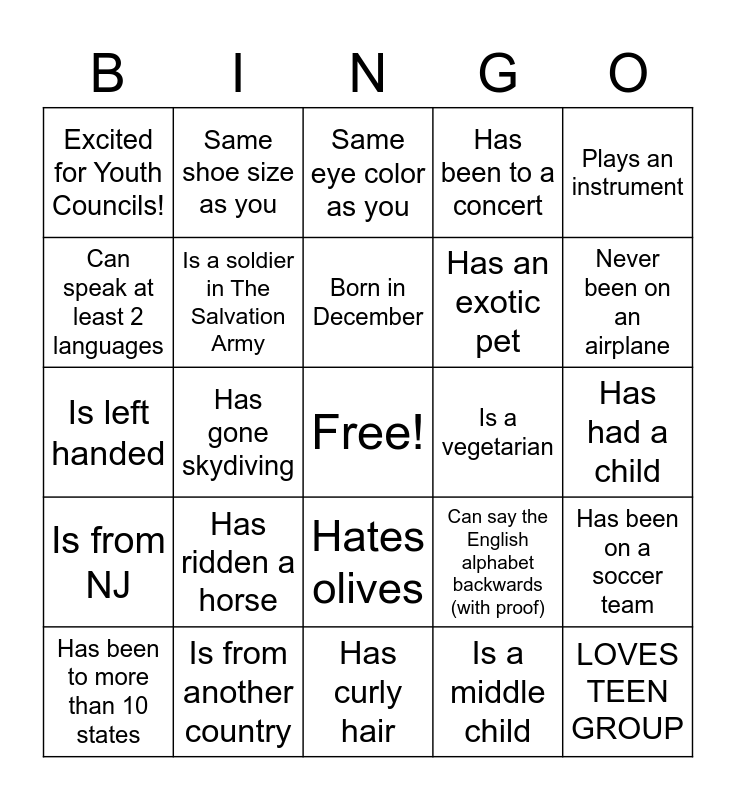 This bingo card has a free space and 24 words: Has ridden a horse, Is from another country, Born in December, Has been to more than 10 states, Plays an instrument, Excited for Youth Councils!, Can speak at least 2 languages, Same shoe size as you, Is a vegetarian, Hates olives, Has an exotic pet, Is left handed, Can say the English alphabet backwards (with proof), Has been on a soccer team, Is a soldier in The Salvation Army, Is a middle child, Has had a child, Same eye color as you, Never been on an airplane, Has gone skydiving, LOVES TEEN GROUP, Is from NJ, Has been to a concert and Has curly hair.