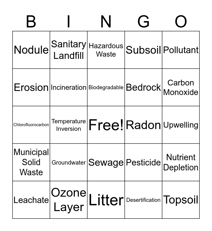 This bingo card has a free space and 33 words: Photochemical Smog, Ozone, Temperature Inversion, Land Reclamation, Municipal Solid Waste, Incineration, Pollutant, Leachate, Sanitary Landfill, Recycling, Biodegradable, Hazardous Waste, Emissions, Acid Rain, Radon, Carbon Monoxide, Ozone Layer, Chlorofluorocarbon, Groundwater, Pesticide, Sewage, Sediment, Nodule, Upwelling, Litter, Topsoil, Subsoil, Bedrock, Erosion, Nutrient Depletion, Fertilizer, Desertification and Drought.