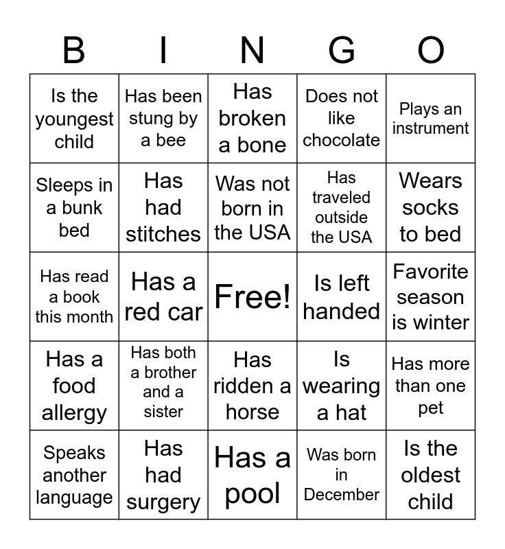 This bingo card has a free space and 24 words: Has both a brother and a sister, Has had surgery, Was not born in the USA, Speaks another language, Plays an instrument, Is the youngest child, Sleeps in a bunk bed, Has been stung by a bee, Is left handed, Has ridden a horse, Has traveled outside the USA, Has read a book this month, Is wearing a hat, Has more than one pet, Has had stitches, Was born in December, Favorite season is winter, Has broken a bone, Wears socks to bed, Has a red car, Is the oldest child, Has a food allergy, Does not like chocolate and Has a pool.