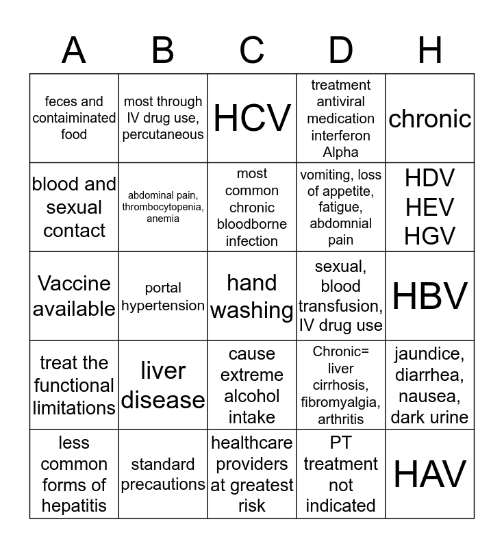 This bingo card has 25 words: liver disease, healthcare providers at greatest risk, most common chronic bloodborne infection, less common forms of hepatitis, chronic, feces and contaiminated food, blood and sexual contact, most through IV drug use, percutaneous, sexual, blood transfusion, IV drug use, cause extreme alcohol intake, vomiting, loss of appetite, fatigue, abdomnial pain, Vaccine available, Chronic= liver cirrhosis, fibromyalgia, arthritis, jaundice, diarrhea, nausea, dark urine, abdominal pain, thrombocytopenia, anemia, HAV, HBV, HCV, HDV HEV HGV, portal hypertension, hand washing, standard precautions, treat the functional limitations, treatment antiviral medication interferon Alpha and PT treatment not indicated.