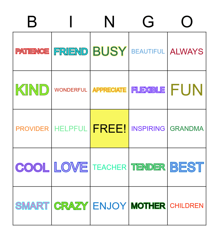 This bingo card has a free space and 44 words: THANKFUL, LOVE, HEART, MOTHER, GREAT, SUPER, WONDERFUL, THOUGHTFUL, BEAUTIFUL, CHILDREN, PATIENCE, CRAZY, TENDER, GRANDMA, FUNNY, LIFE, ENJOY, INSPIRING, SUPERHERO, PROVIDER, FRIEND, TEACHER, SCHOOL, ALWAYS, ACCEPTING, AMAZING, APPRECIATE, BELOVED, BEST, SMART, BRAVE, BUSY, CARING, CHERISHED, COOL, STRONG, SUPPORTIVE, PROTECTIVE, FUN, KIND, HELPFUL, GIVING, FLEXIBLE and PROUD.