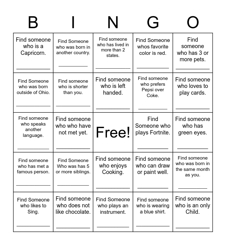 This bingo card has a free space and 25 words: Find Someone Who was has 5 or more siblings. ____________, Find Someone who plays an instrument. ___________, Find someone who is left handed. ___________, Find Someone who likes to Sing. ____________, Find someone who has 3 or more pets. ___________, Find someone who is a Capricorn. ___________, Find Someone who was born outside of Ohio. _____________, Find Someone who was born in another country. ___________, Find Someone who plays Fortnite. __________, Find someone who enjoys Cooking. ___________, Find someone who prefers Pepsi over Coke. ___________, Find someone who speaks another language. ____________, Find someone who can draw or paint well. __________, Find someone who was born in the same month as you. ___________, Find someone who is shorter than you. _____________, Find someone who has been on a cruise. ___________, Find someone who has green eyes. __________, Find someone who has lived in more than 2 states. ______________, Find someone who loves to play cards. ___________, Find someone who who have not met yet. ___________, Find someone who is an only Child. ___________, Find someone who does not like chocolate. ___________, Find someone who has met a famous person. _____________, Find Someone whos favorite color is red. ___________ and Find someone who is wearing a blue shirt. ____________.