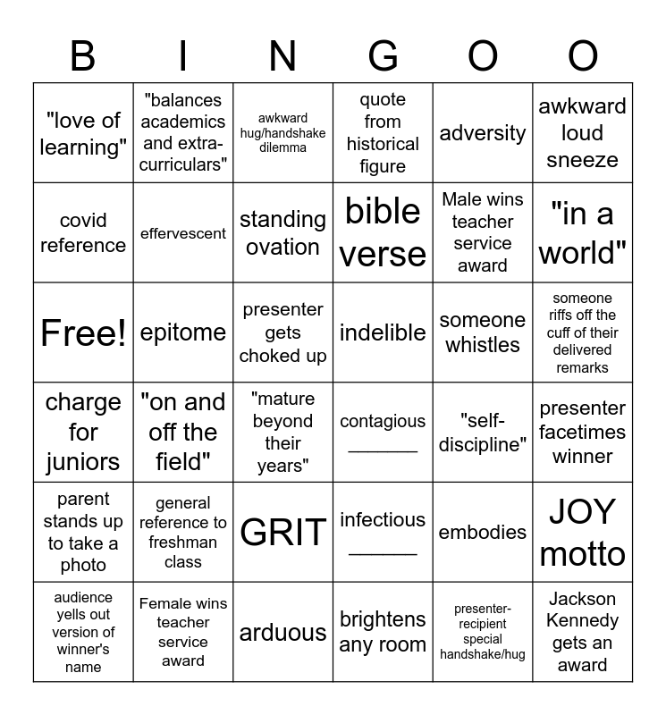 This bingo card has 36 words: infectious ______, GRIT, brightens any room, covid reference, charge for juniors, indelible, effervescent, arduous, adversity, embodies, "in a world", quote from historical figure, JOY motto, epitome, bible verse, "love of learning", parent stands up to take a photo, someone whistles, Free!, awkward hug/handshake dilemma, presenter gets choked up, "on and off the field", contagious _______, "mature beyond their years", "self-discipline", "balances academics and extra-curriculars", Male wins teacher service award, Female wins teacher service award, standing ovation, awkward loud sneeze, Jackson Kennedy gets an award, audience yells out version of winner's name, presenter facetimes winner, someone riffs off the cuff of their delivered remarks, general reference to freshman class and presenter-recipient special handshake/hug.
