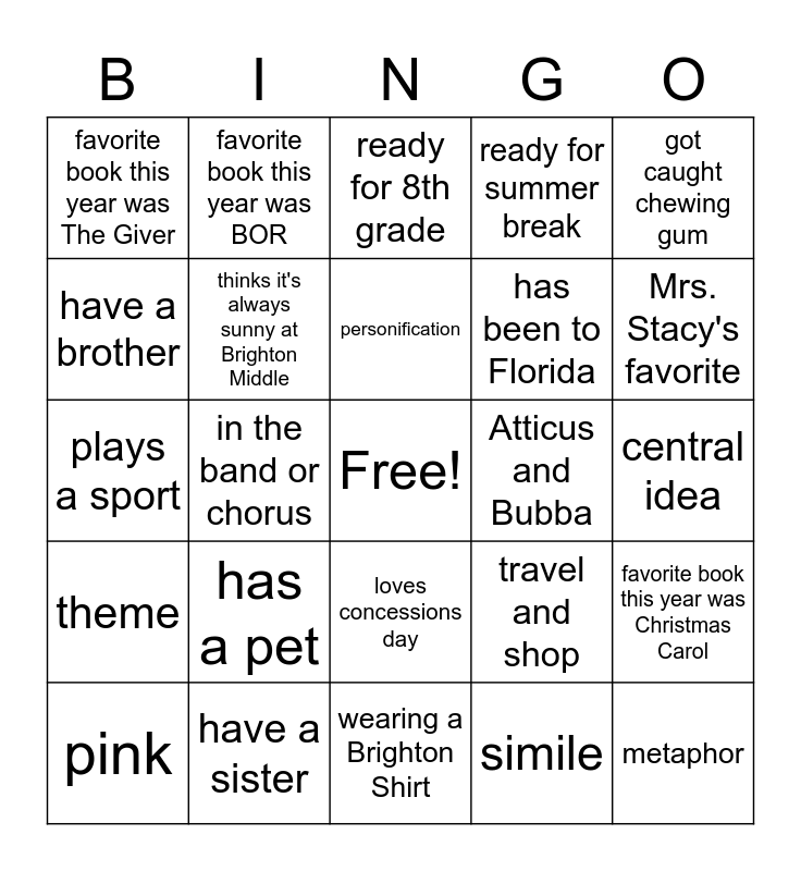 This bingo card has a free space and 24 words: has a pet, have a sister, personification, pink, got caught chewing gum, favorite book this year was The Giver, have a brother, favorite book this year was BOR, Atticus and Bubba, loves concessions day, has been to Florida, plays a sport, travel and shop, favorite book this year was Christmas Carol, thinks it's always sunny at Brighton Middle, simile, central idea, ready for 8th grade, Mrs. Stacy's favorite, in the band or chorus, metaphor, theme, ready for summer break and wearing a Brighton Shirt.