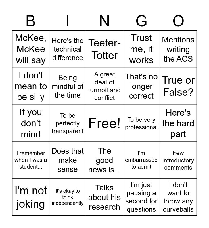This bingo card has a free space and 29 words: I'm not joking, In all seriousness, To be perfectly transparent, I'm talking to you as the smart, scientific people you are, McKee, McKee will say, Teeter-Totter, Being mindful of the time, Does that make sense, To be very professional, It's okay to think independently, Here's the hard part, I don't want to throw any curveballs, Talks about his research, I'm just pausing a second for questions, True or False?, *thumbs up, The good news is..., I remember when I was a student..., Mentions writing the ACS, If you don't mind, I'm embarrassed to admit, This is not the dissertation on..., That's no longer correct, I don't mean to be silly, Trust me, it works, Here's the technical difference, Few introductory comments, A great deal of turmoil and conflict and In the old days....