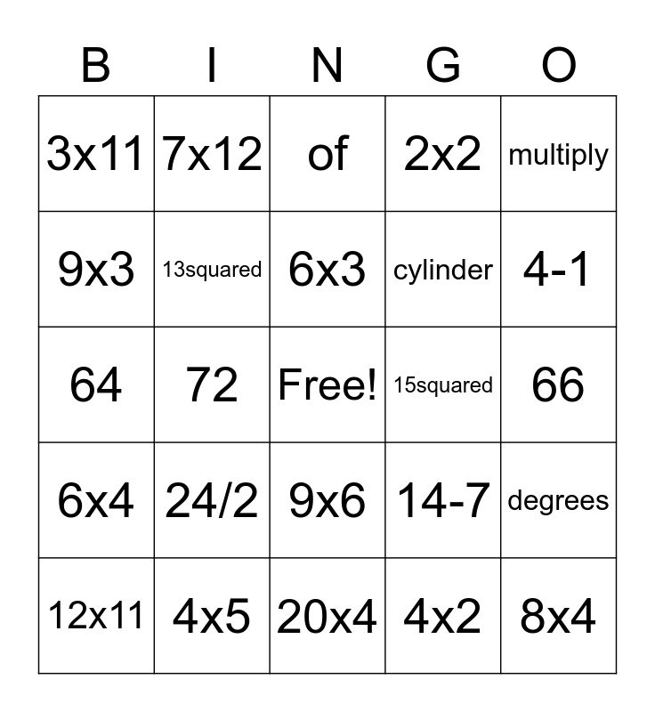 This bingo card has a free space and 103 words: +, -, multiply, divide, fraction, ratio, y, constant, triangle, rectangle, positive, negative, exponent, (), decimal, percent, of, <, >, factor, product, quotient, discount, tax, 1x1, 24/2, 4-1, 2x2, 11-6, 2x3, 14-7, 4x2, 81/9, 90/9, 6+5, 121/11, 7x2, 4squared, 6x3, 4x5, 2x11, 6x4, 7x3, 9x3, 6x5, 3x11, 7x4, 8x4, 6squared, 4x10, 11x4, 12x4, 7x5, 8x5, 9x5, 10x5, 5(5+6), 60, 6x7, 9x6, 66, 72, 7squared, 56, 63, 70, 77, 7x12, 64, 72, 20x4, 88, 96, 9squared, 90, 99, 11squared, 12x11, 10squared, 110, 120, 12squared, 13squared, 14squared, 15squared, 16squared, A = lh, V = lwh, Sum of all sides of a shape, Measurement around a circle, Pi, The number of degrees in a circle or square, degrees, trapezoid, parallelogram, a diamond shape with 4 equal sides, cylinder, square pyramid, rectangular prism, cube, circle, sphere and cone.