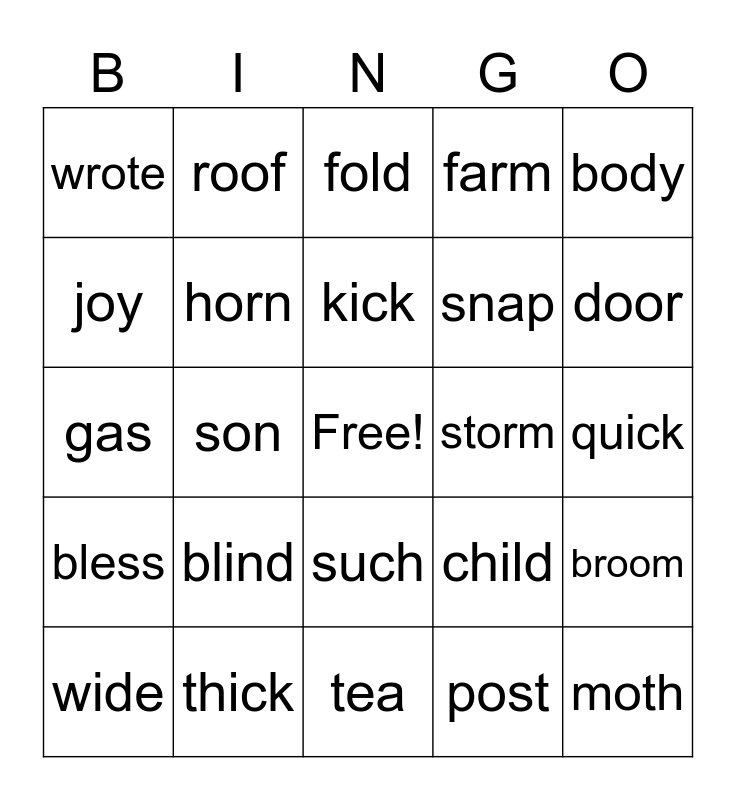 This bingo card has a free space and 29 words: wide, pace, son, neck, wrote, fold, horn, blind, storm, thick, quick, moth, tea, post, door, spade, such, bless, body, gas, child, stem, snap, joy, farm, roof, broom, kick and swim.