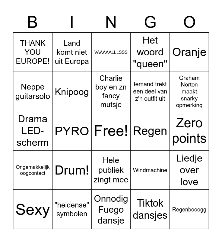 This bingo card has a free space and 24 words: Drum!, "heidense" symbolen, Charlie boy en zn fancy mutsje, Sexy, Oranje, THANK YOU EUROPE!, Neppe guitarsolo, Land komt niet uit Europa, Regen, Hele publiek zingt mee, Iemand trekt een deel van z'n outfit uit, Drama LED-scherm, Windmachine, Liedje over love, Knipoog, Tiktok dansjes, Zero points, VAAAAALLLSSS, Graham Norton maakt snarky opmerking, PYRO, Regenbooogg, Ongemakkelijk oogcontact, Het woord "queen" and Onnodig Fuego dansje.