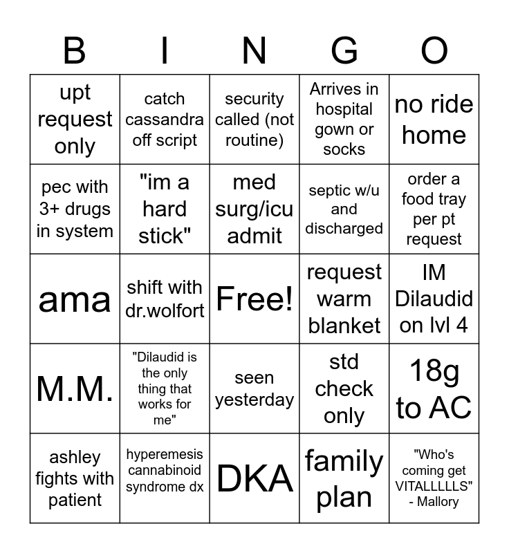 This bingo card has a free space and 24 words: "Dilaudid is the only thing that works for me", hyperemesis cannabinoid syndrome dx, med surg/icu admit, ashley fights with patient, no ride home, upt request only, pec with 3+ drugs in system, catch cassandra off script, request warm blanket, seen yesterday, septic w/u and discharged, ama, std check only, 18g to AC, "im a hard stick", family plan, IM Dilaudid on lvl 4, security called (not routine), order a food tray per pt request, shift with dr.wolfort, "Who's coming get VITALLLLLS" - Mallory, M.M., Arrives in hospital gown or socks and DKA.