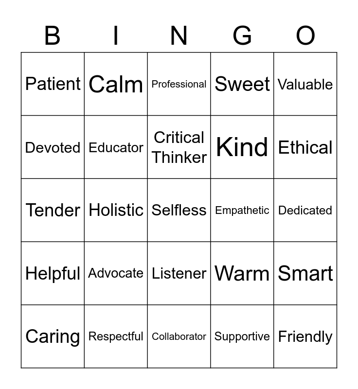 This bingo card has a free space and 29 words: Caring, Compassionate, Holistic, Caregiver, Patient, Professional, Educator, Advocate, Empathetic, Respectful, Dedicated, Friendly, Collaborator, Supportive, Ethical, Healer, Listener, Helpful, Valuable, Tender, Warm, Gracious, Kind, Devoted, Sweet, Calm, Smart, Critical Thinker and Team player.