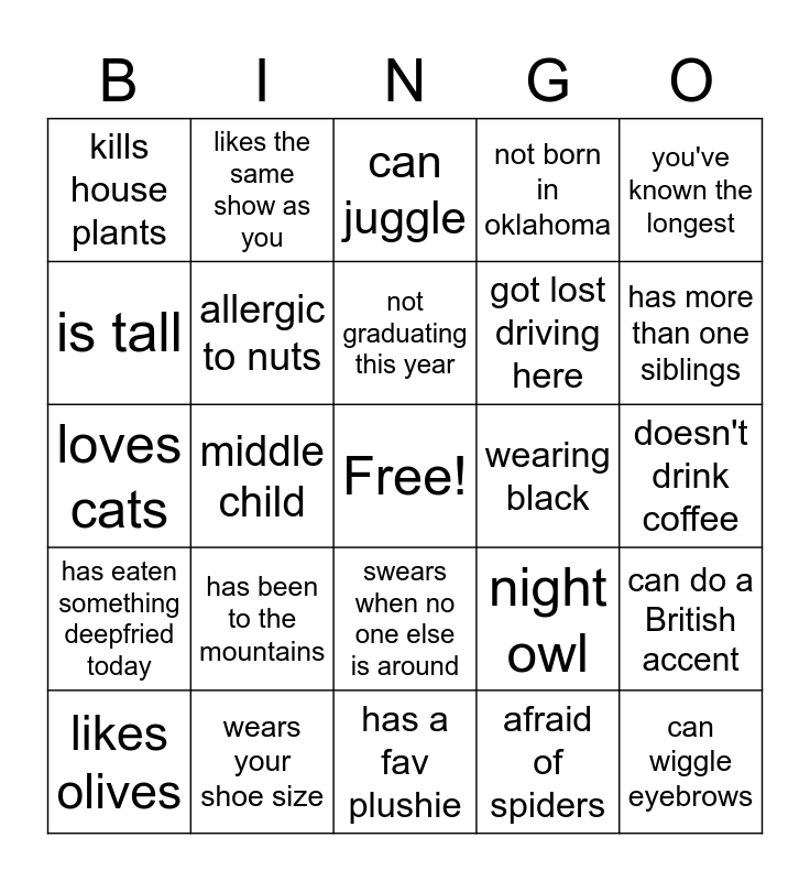 This bingo card has a free space and 24 words: has been to the mountains, wears your shoe size, not graduating this year, likes olives, you've known the longest, kills house plants, is tall, likes the same show as you, wearing black, swears when no one else is around, got lost driving here, loves cats, night owl, can do a British accent, allergic to nuts, afraid of spiders, doesn't drink coffee, can juggle, has more than one siblings, middle child, can wiggle eyebrows, has eaten something deepfried today, not born in oklahoma and has a fav plushie.