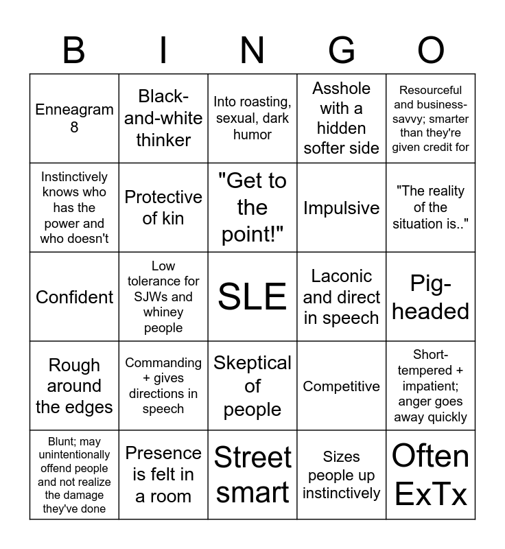 This bingo card has a free space and 24 words: Commanding + gives directions in speech, Presence is felt in a room, "Get to the point!", Blunt; may unintentionally offend people and not realize the damage they've done, Resourceful and business-savvy; smarter than they're given credit for, Enneagram 8, Instinctively knows who has the power and who doesn't, Black-and-white thinker, Laconic and direct in speech, Skeptical of people, Impulsive, Confident, Competitive, Short-tempered + impatient; anger goes away quickly, Protective of kin, Sizes people up instinctively, Pig-headed, Into roasting, sexual, dark humor, "The reality of the situation is..", Low tolerance for SJWs and whiney people, Often ExTx, Rough around the edges, Asshole with a hidden softer side and Street smart.