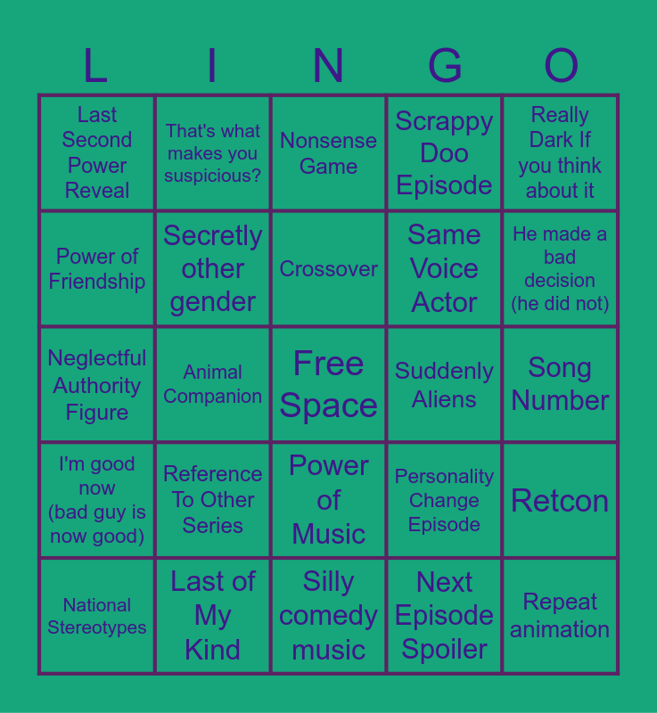 This bingo card has a free space and 60 words: Murder, Last of My Kind, Famous 'Cameo' insert, I'm good now (bad guy is now good), Next Episode Spoiler, A wizard did it, Secretly other gender, Dumb Betrayal, Same Voice Actor, One-Time Skill, Scrappy Doo Episode, Fakeout Death, Power of Friendship, It's Immune to Magic!, One-Time Weakness, Last Second Power Reveal, Repeat animation, Really Dark If you think about it, Protagonist Centered Morals, Crossover, Suddenly Aliens, Nonsense Game, National Stereotypes, Retcon, Secret good/bad guy, Animation shift (Style shift), Orphan, That's a child, He made a bad decision (he did not), Nightmare Episode, Repeated Plot Point, Out of Order Episodes, Bully Character, Sudden Intro Change, That's what makes you suspicious?, Prophecy, Suddenly Attractive, Animal Companion, Reasonable Authority Figure, Neglectful Authority Figure, Fourth Wall Break, Reference To Other Series, Song Number, Girl don't get to fight, Personality Change Episode, Recurring Character, Multiple Episode Arc, Romance Plot, That's just a funny cat, Power of Music, Silly comedy music, 'Bad Acting', Sudden Backstory, Heroic Sacrifice, Time travel episode, Fake Swearing (darn it), 'Third act misunderstanding', World War Happened, That's not yours! (gives away others properties) and Holiday Episode.