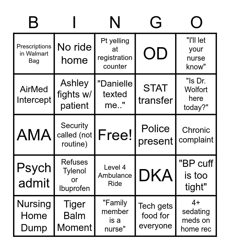 This bingo card has a free space and 95 words: Septic work up and then discharged, "Pt CC: I'm Dehydrated", Tech gets food for everyone, "I have rolling veins", Telestroke, Request a doctor, doesn't want to see midlevel, Family plan (3+), Tiger Balm Moment, "Dilaudid is the only thing that works for me", MD borrows ink pen, 1 episode of diarrhea, Request cab voucher, Chest pain with negative trop, "Danielle texted me..", "WHEELCHAIR ON THE RAMP", Prescriptions in Walmart Bag, "Is Dr. Wolfort here today?", Seen yesterday, Male Vaginitis, B52, Brianna answers your question with sarcasm, Disimpaction, Request work excuse in triage, Pain score of 10/10 while texting, OD, AirMed Intercept, IM Dilaudid on Level 4 patient, STAT transfer, Hyperemesis Cannabinoid Syndrome Dx, Treats frequent flyer, Refuses Tylenol or Ibuprofen, Transfer hold for > 24 hours, Floor nurse can't take report, LERN Patient, Nursing Home Dump, OPC, "Family member is a nurse", Request warm blanket in triage, AMA, Shift w/ Dr. Wolfort, "BP cuff is too tight", Security called (not routine), Level 4 Ambulance Ride, "I'll let your nurse know", DKA, Police present, CIS Consult, Michael mentions his chickens, Med Surg/ICU Admit, Cursed at by patient, "I don't usually ask for pain medications...", Pt requires Wolfort soup, Multiple tattoos, "I hate needles", Catch Cassandra off script, Assigned to hall patient, STD Screening, Restraints used, "Back away from the door", Hits call bell within 30 minutes of arrival, Patient reeks of THC, Ashley fights w/ patient, Refuses discharge, 18 g IV to AC, ETOH >300, "Who's coming get VITALLLS" -Mallory, Hypotension, > 6 EMS patients in 12 hour shift, Abd Pain requesting Food/Water, Pt yelling at registration counter, "Running fever" but didn't check it., Order food tray per request, Gives blanket in lobby, 4+ sedating meds on home rec, PEC w/ 3+ drugs in system, Toothache, All 3 swabs negative, Foreign Body, Arrives in hospital gown or socks, STEMI, No ride home, M.M., CBG > 400, Hypoglycemia, "CHEST PAIN AT THE WINDOW", Chronic complaint, Psych admit, UPT Request Only, Triage and Discharged within 20 minutes, Vomited x 1, "I'm a hard stick", Narcan given, Toradol allergy, CVS run, Cassandra gets a unwanted hug and Catches Wolfort without gloves touching a patient.
