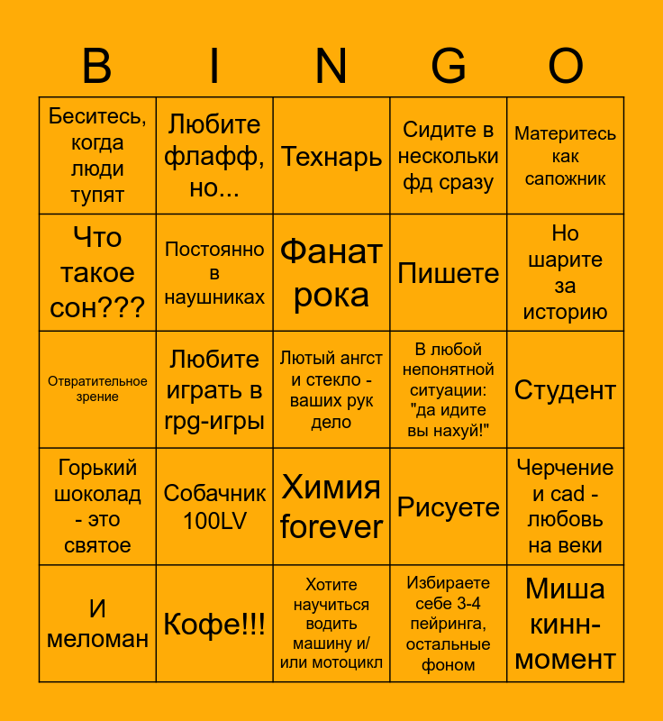 This bingo card has a free space and 24 words: Собачник 100LV, Кофе!!!, Фанат рока, И меломан, Материтесь как сапожник, Беситесь, когда люди тупят, Что такое сон???, Любите флафф, но..., В любой непонятной ситуации: "да идите вы нахуй!", Химия forever, Пишете, Отвратительное зрение, Рисуете, Черчение и cad - любовь на веки, Постоянно в наушниках, Избираете себе 3-4 пейринга, остальные фоном, Студент, Технарь, Но шарите за историю, Любите играть в rpg-игры, Миша кинн-момент, Горький шоколад - это святое, Сидите в нескольки фд сразу and Хотите научиться водить машину и/или мотоцикл.