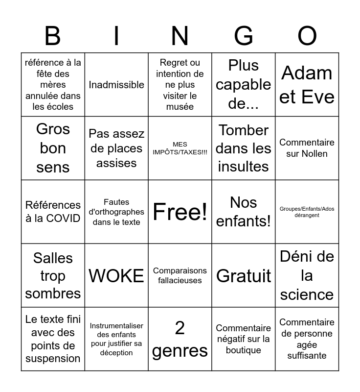 This bingo card has a free space and 25 words: WOKE, 2 genres, MES IMPÔTS/TAXES!!!, Le texte fini avec des points de suspension, Adam et Eve, référence à la fête des mères annulée dans les écoles, Gros bon sens, Inadmissible, Nos enfants!, Comparaisons fallacieuses, Tomber dans les insultes, Références à la COVID, Gratuit, Déni de la science, Pas assez de places assises, Écritures trop petites, Groupes/Enfants/Ados dérangent, Regret ou intention de ne plus visiter le musée, Commentaire sur Nollen, Fautes d'orthographes dans le texte, Commentaire de personne agée suffisante, Instrumentaliser des enfants pour justifier sa déception, Salles trop sombres, Plus capable de... and Commentaire négatif sur la boutique.