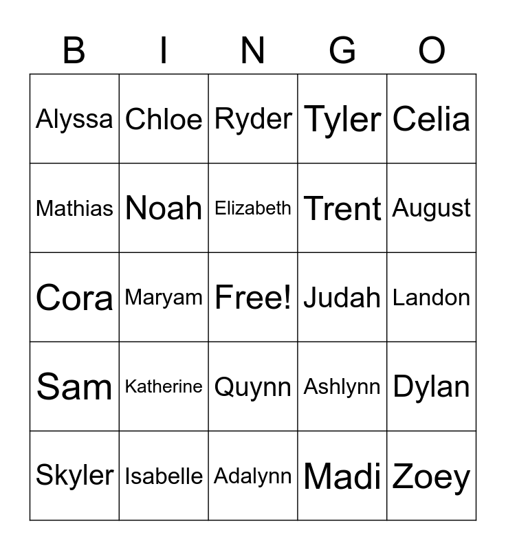 This bingo card has a free space and 24 words: Katherine, Isabelle, Elizabeth, Skyler, Celia, Alyssa, Mathias, Chloe, Judah, Quynn, Trent, Cora, Ashlynn, Dylan, Noah, Madi, Landon, Ryder, August, Maryam, Zoey, Sam, Tyler and Adalynn.