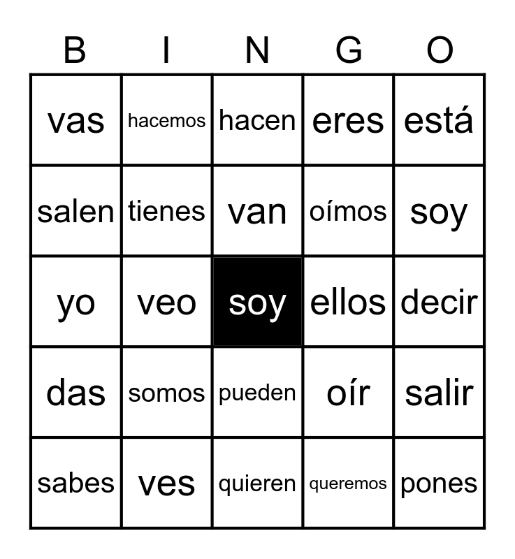 This bingo card has a free space and 101 words: da, dice, está, hace, puede, pone, quiere, sabe, sale, es, tiene, trae, va, ve, viene, doy, das, damos, dan, digo, dices, dicen, estoy, estás, están, soy, eres, somos, hago, haces, hacemos, hacen, puedo, puedes, podemos, pueden, quiero, quieres, queremos, quieren, sé, sabes, sabemos, saben, pongo, pones, ponemos, ponen, salgo, sales, salimos, salen, traigo, traes, traemos, traen, vienes, venimos, vienen, tengo, tienes, tenemos, tienen, oigo, oyes, oímos, oyen, veo, ves, vemos, ven, voy, vas, vamos, van, yo, tú, él, ella, usted, nosotros, nosotras, ellos, ellas, ustedes, dar, decir, ser, estar, hacer, oír, poner, poder, querer, saber, salir, tener, traer, ir, ver and venir.