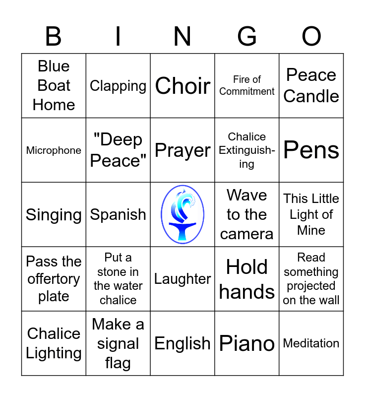 This bingo card has a free space and 24 words: Put a stone in the water chalice, Make a signal flag, Prayer, Chalice Lighting, Peace Candle, Blue Boat Home, Microphone, Clapping, Wave to the camera, Laughter, Chalice Extinguish-ing, Singing, Hold hands, Read something projected on the wall, "Deep Peace", Piano, This Little Light of Mine, Choir, Pens, Spanish, Meditation, Pass the offertory plate, Fire of Commitment and English.