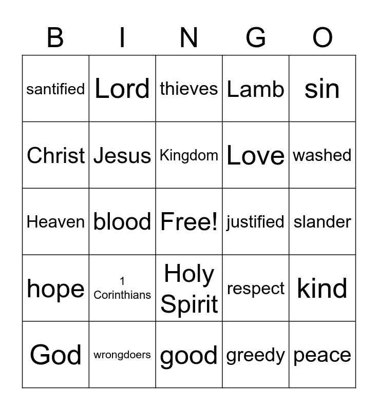 This bingo card has a free space and 24 words: 1 Corinthians, wrongdoers, Kingdom, God, sin, santified, Christ, Lord, justified, Holy Spirit, Love, Heaven, respect, kind, Jesus, greedy, slander, thieves, washed, blood, peace, hope, Lamb and good.